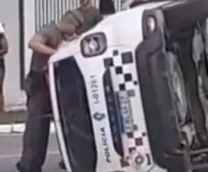Viatura capota após colisão em área de grande movimento, policial fica preso nas ferragens e é resgatado pelos bombeiros em São José dos Campos