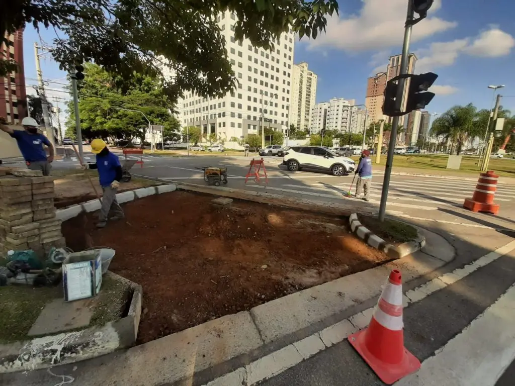 Estão em andamento as obras para melhoria de acessibilidade e conexão de malha cicloviária na região da rotatória na avenida Cassiano Ricardo próxima à Praça Riugi Kojima, no Jardim Aquarius, região oeste de São José dos Campos.