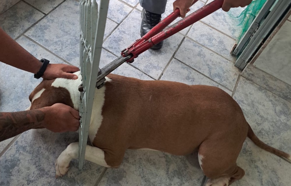 Cachorro é resgatado sem ferimento após ficar preso em grade em Caraguatatuba