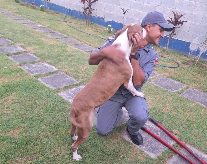 Ao chegar ao local, os bombeiros constataram que o cachorro se encontrava imobilizado, com risco de sofrer ferimentos caso tentasse se soltar sozinho. Diante da situação, a guarnição iniciou o resgate utilizando técnicas adequadas para evitar lesões no animal.