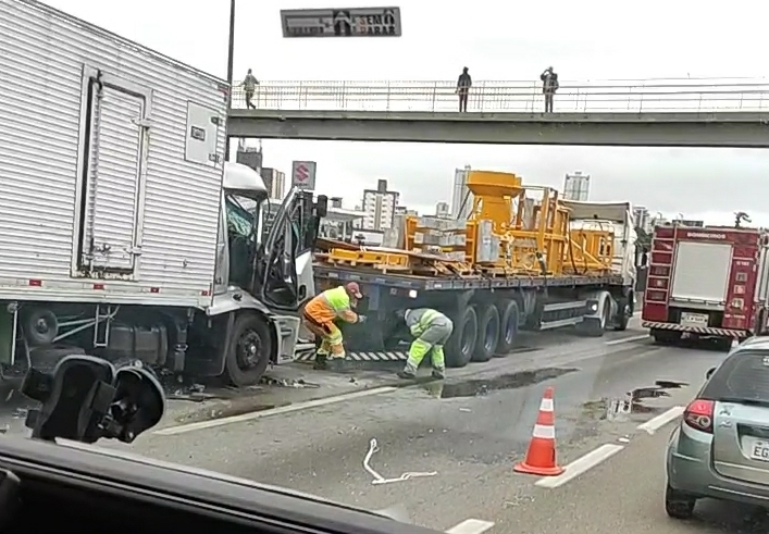 Motorista de um caminhão não conseguiu frear a tempo e bateu na traseira de um outro caminhão. Duas pessoas ficaram feridas e levadas ao Pronto-Socorro da Vila Industrial. Ainda não se sabe o estado de saúde delas. Houve lentidão na rodovia, também ocasionada pela forte chuva que caiu na região.