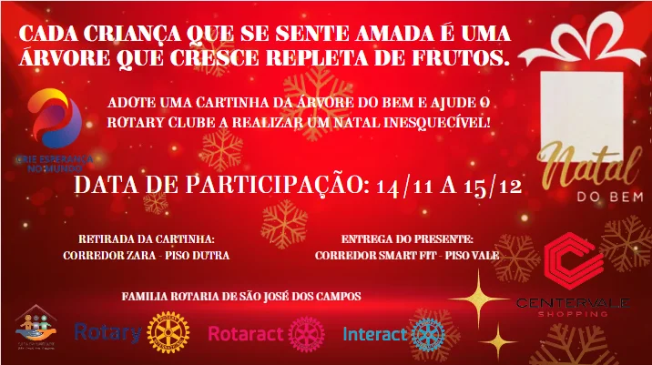 O Rotary Clube de São José dos Campos convida calorosamente a todos a participarem desta nobre causa. Adotar uma cartinha da Árvore do Bem é uma oportunidade de espalhar alegria e fazer a diferença na vida de uma criança neste Natal. A participação de cada indivíduo é essencial para o sucesso dessa ação. Juntos, podemos tornar o Natal de muitas crianças mais feliz! Seja parte desta corrente de solidariedade e amor ao próximo.