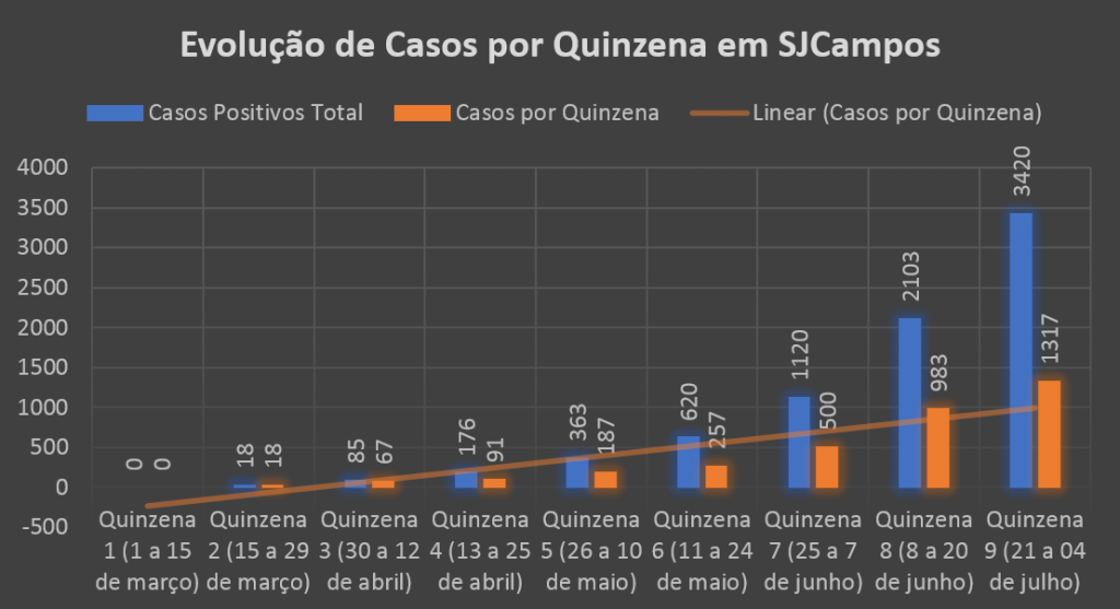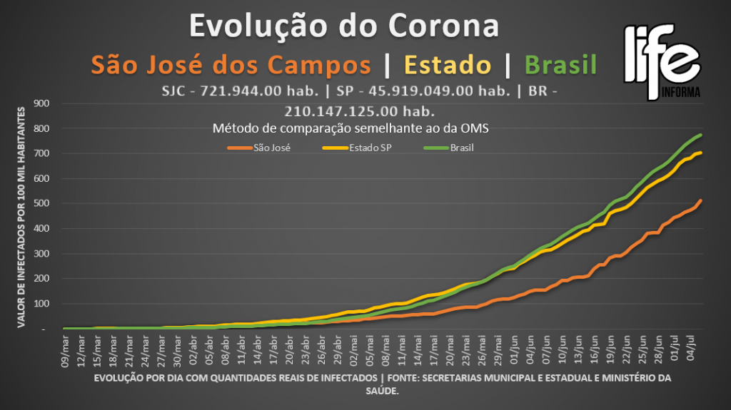Segue o gráfico apurado pela Life com dados oficiais dos órgãos públicos nas esferas municipal, estadual e federal. A curva da doença do novo coronavírus em São José dos Campos, que vinha pareando com o estado de SP em junho, indica entre o final de junho e o começo de julho um aumento de casos em São José e uma diminuição no estado de SP. Lembrando que este gráfico segue as regras utilizadas pela OMS – Valor de infectados por 100 mil habitantes.