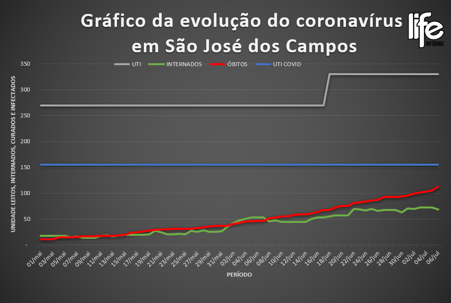 Já o segundo gráfico abaixo, com dados oficiais da Secretaria da Saúde de São José dos Campos, mostra os leitos de UTI da cidade, onde temos 155 Leitos de UTIs para Covid-19 em São José, num total de 330 UTIs, contando Particular e Pública. O número de óbitos vem crescendo. Colocamos também neste gráfico a quantidade de pessoas internadas com Covid-19 e também os suspeitos da doença nos leitos de UTIs.