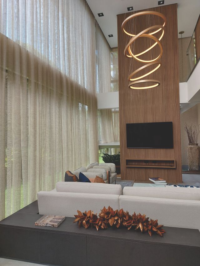 A sala de estar é o coração da morada, comunicando-se com toda casa onde se destaca o painel ripado acompanhando o pé direito duplo. Os panos de vidro banham o interior de luz e ainda permitem que de dentro da casa se desfrute dos atrativos naturais da área externa.