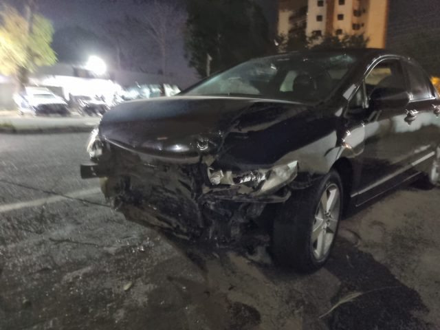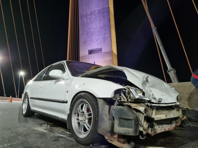 Segundo informações no local, o motorista do carro preto estava fugindo de um motoqueiro e subiu a ponte na contramão. Na colisão, ele abandonou o carro e fugiu.