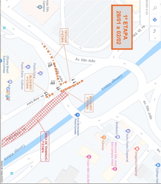 No primeiro, de 28 de janeiro a 8 de fevereiro, será necessário realizar a interdição da alça de acesso da rotatória no sentido Centro e um trecho de cerca de 100 metros da pista principal da Avenida Jorge Zarur, no sentido região sul. O trânsito será desviado para a pista marginal da via. (imagem abaixo)