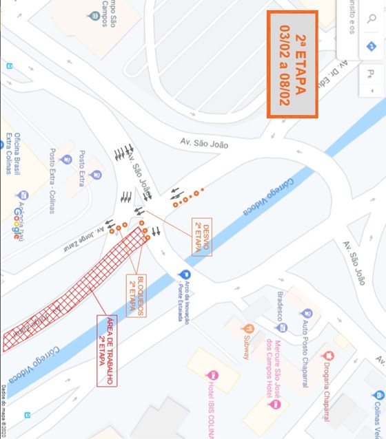 A segunda etapa está prevista para acontecer do dia 3 de fevereiro ao dia 8 do mesmo mês. Nesta fase, será liberado o acesso da rotatória no sentido centro, permanecendo a interdição na Avenida Jorge Zarur. (imagem abaixo)