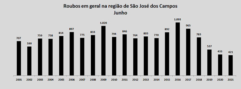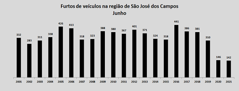 A região de São José dos Campos terminou o mês de junho com redução nos roubos e furtos de veículos e roubos em geral e estupros. Os indicadores de latrocínios, roubos a bancos e extorsões mediante sequestro permaneceram zerados.