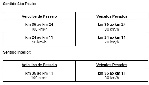 Neste primeiro momento, estão sendo instaladas placas com os novos limites e será realizada uma campanha educativa, sem a aplicação de multas, para que os usuários tomem conhecimento da mudança. Após período educativo, os radares serão atualizados e a fiscalização passará a ser com função punitiva caso os motoristas não respeitem os novos limites estabelecidos após o início das novas referências. Atualmente, os limites de velocidade são de 120 km/h para carros e 90 km/h para caminhões. Confira a seguir as novas referências para cada trecho: