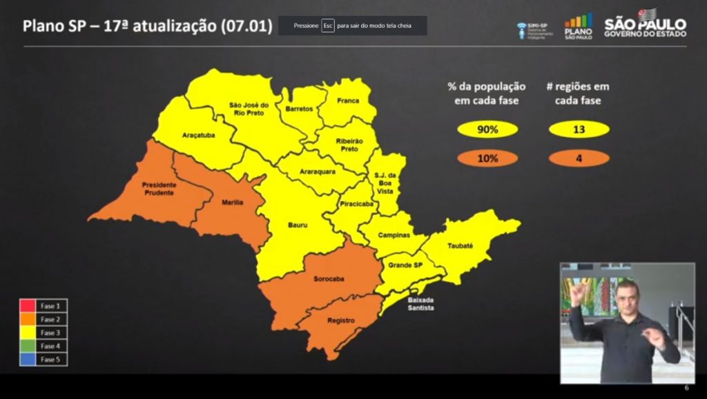 Com a manutenção na fase amarela, bares podem funcionar com atendimento presencial até às 20h; restaurantes até às 22h, com interrupção de vendas de bebidas alcoólicas às 20h. Comércios seguem com liberação de 40% de ocupação e 10 horas de funcionamento diário. Sobre a vacinação, o Estado confirmou o início para o dia 25 de janeiro. Novas informações em instantes.
