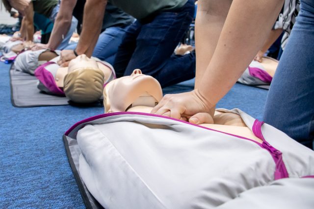 Durante a capacitação, o grupo praticou ritmo, força e posição correta da compressão torácica usando manequins, aprendendo a manter o coração funcionando até que a pessoa volte a respirar ou até a chegada de ajuda especializada, como o SAMU.