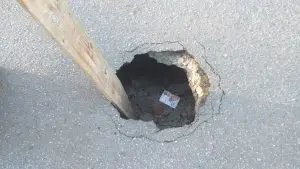 O buraco apareceu na sexta (23) e o diâmetro aumento neste sábado (24). Comerciantes da região improvisaram sinalização para avisar aos motoristas.