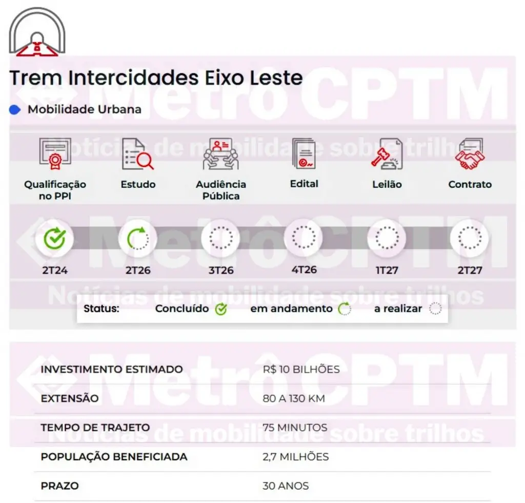 Com um custo estimado em R$ 10 bilhões, os estudos técnicos do TIC Eixo Leste devem ser finalizados no segundo trimestre de 2026. Logo após, o leilão e a assinatura do contrato estão previstos para ocorrer no primeiro semestre de 2027.