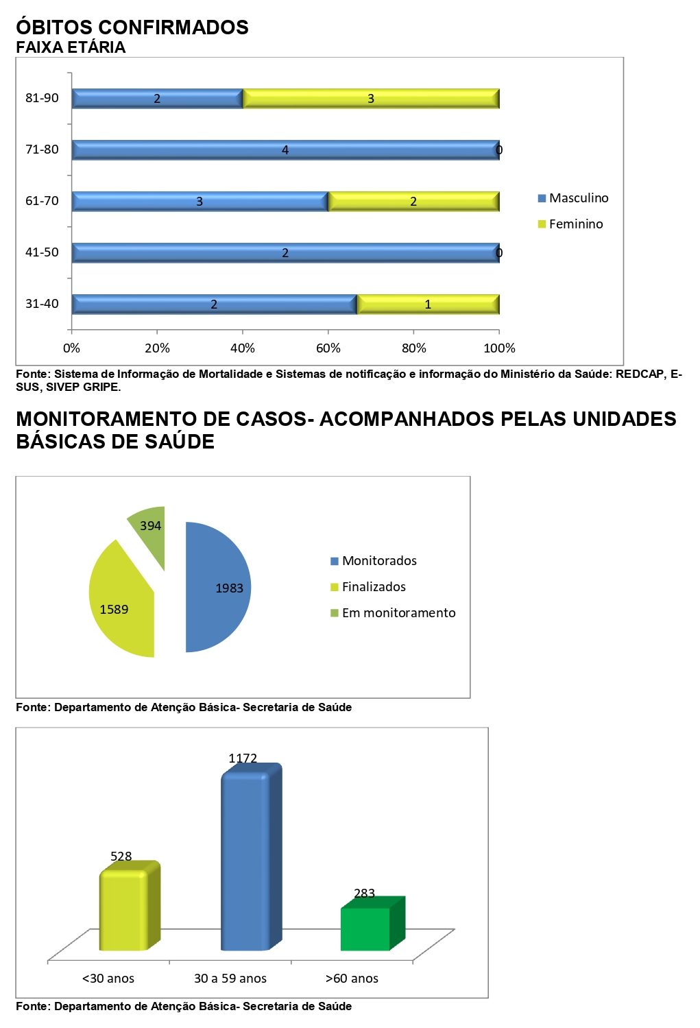 Dos 19 óbitos confirmados, 5 estão na faixa etária de 81 a 90 anos; 5 entre 61 a 70; 4 entre 71 a 80 anos; 2 entre 41 a 50 e 3 entre 31 a 40 anos.