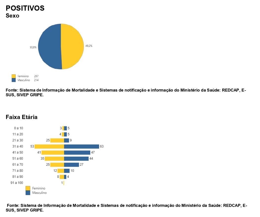 Como ocorre às sextas-feiras, o informe traz um detalhamento dos casos da doença no município. Há mais casos positivos entre os homens (50,8%) e a faixa etária predominante é entre 31 a 40 anos, com 63 casos.