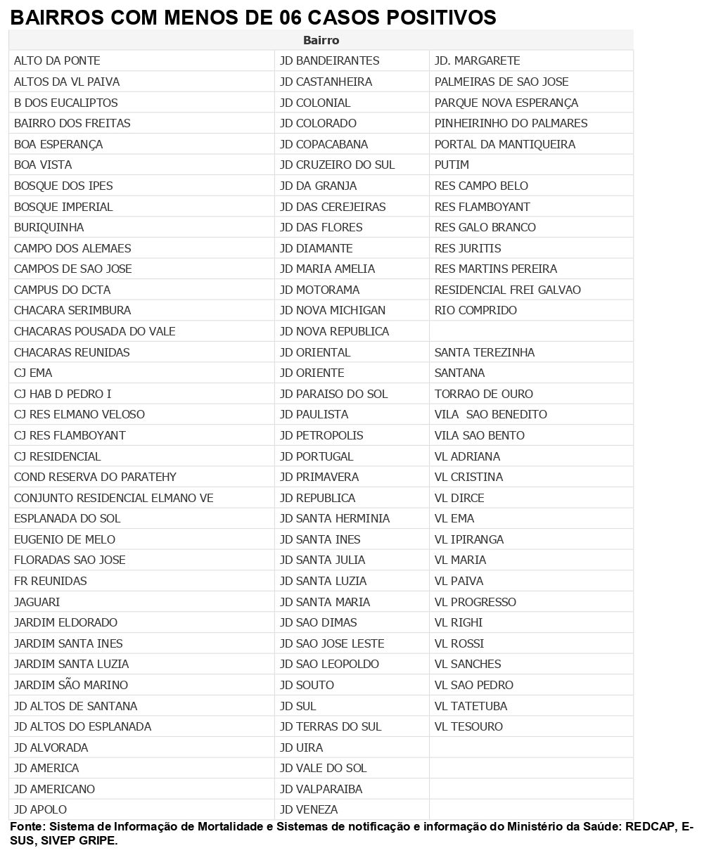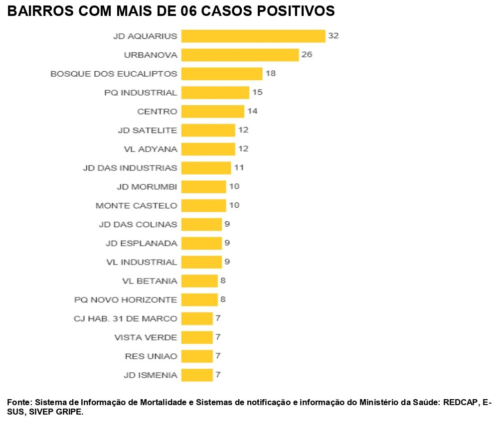 O bairro com maior incidência de casos positivos continua sendo o Jardim Aquarius (32), seguido do Urbanova (26), Bosque dos Eucaliptos (18), Parque Industrial (15) e Centro (14).