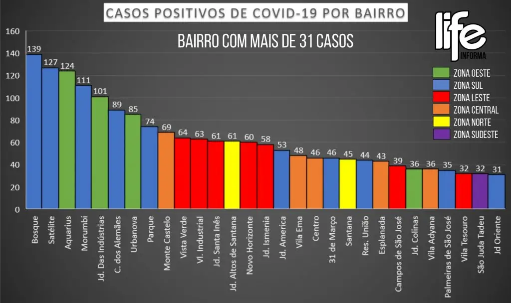 Com 3360 casos positivos de covid-19 em São José dos Campos os bairros Bosque, Satélite, Aquarius, Morumbi e Jd. das Indústrias lideram a lista