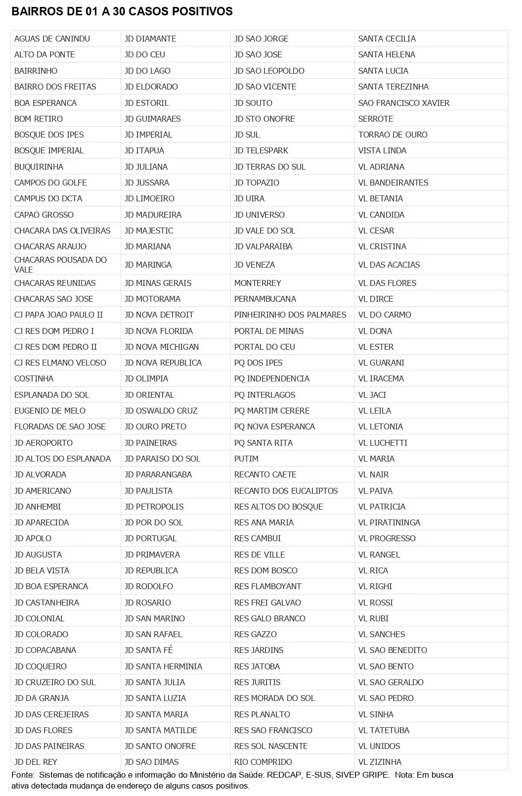 Os bairros com maior incidência de casos positivos são o Bosque dos Eucaliptos (139 casos), Jardim Satélite (127), Jardim Aquarius (124), Jardim Morumbi (111), Jardim das Indústrias (101), Campo dos Alemães (89), Urbanova (85), Parque Industrial (74), Monte Castelo (69) e Vista Verde (64).
