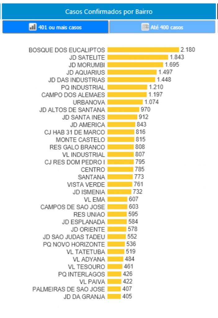 Gráfico abaixo mostra os bairros com mais casos positivos em São José