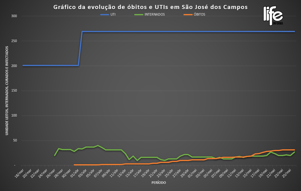 Já o segundo gráfico abaixo, com dados oficiais da Secretaria da Saúde de São José dos Campos, mostra os leitos de UTI da cidade, total de positivos com a curva diária e também os recuperados. O número de óbitos cresceu quase o dobro na última semana. Colocamos também neste gráfico a quantidade de pessoas internadas com Covid-19 e também os suspeitos da doença nos leitos de UTIs.