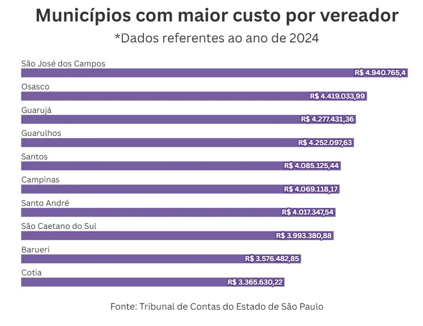 Um levantamento do Tribunal de Contas do Estado de São Paulo (TCE-SP) revelou que os vereadores mais caros do estado, em 2024, foram os de São José dos Campos. Segundo o estudo, cada parlamentar da cidade custou, em média, R$ 4.940.765,40 ao longo do ano. O cálculo inclui salários, encargos de gabinete e despesas como pagamento de assessores, transporte, vestimenta e assinaturas de jornais.