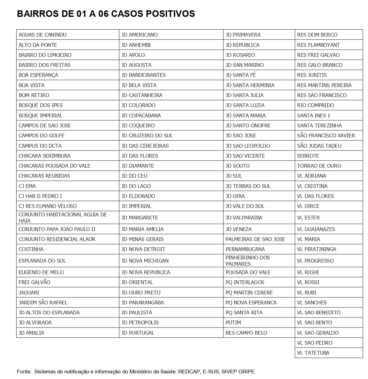 Os bairros com maior incidência de casos positivos são o Jardim Aquarius (42 casos), Urbanova (42), Bosque dos Eucaliptos (36), Jardim Satélite (27), Parque Industrial (23) e Vila Industrial (22).